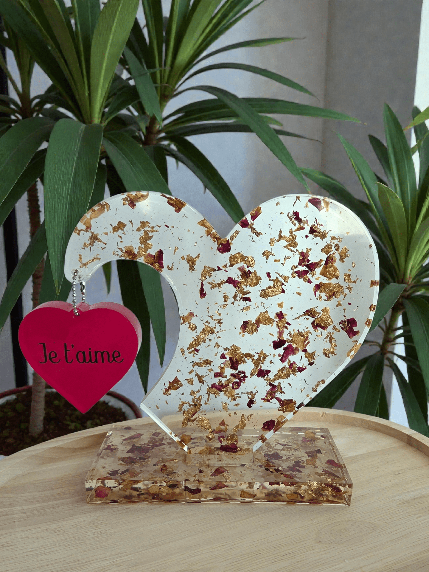 Magnifique coeur réalisé en résine époxy avec pétales de roses et feuilles dorées et son coeur rouge en suspension.