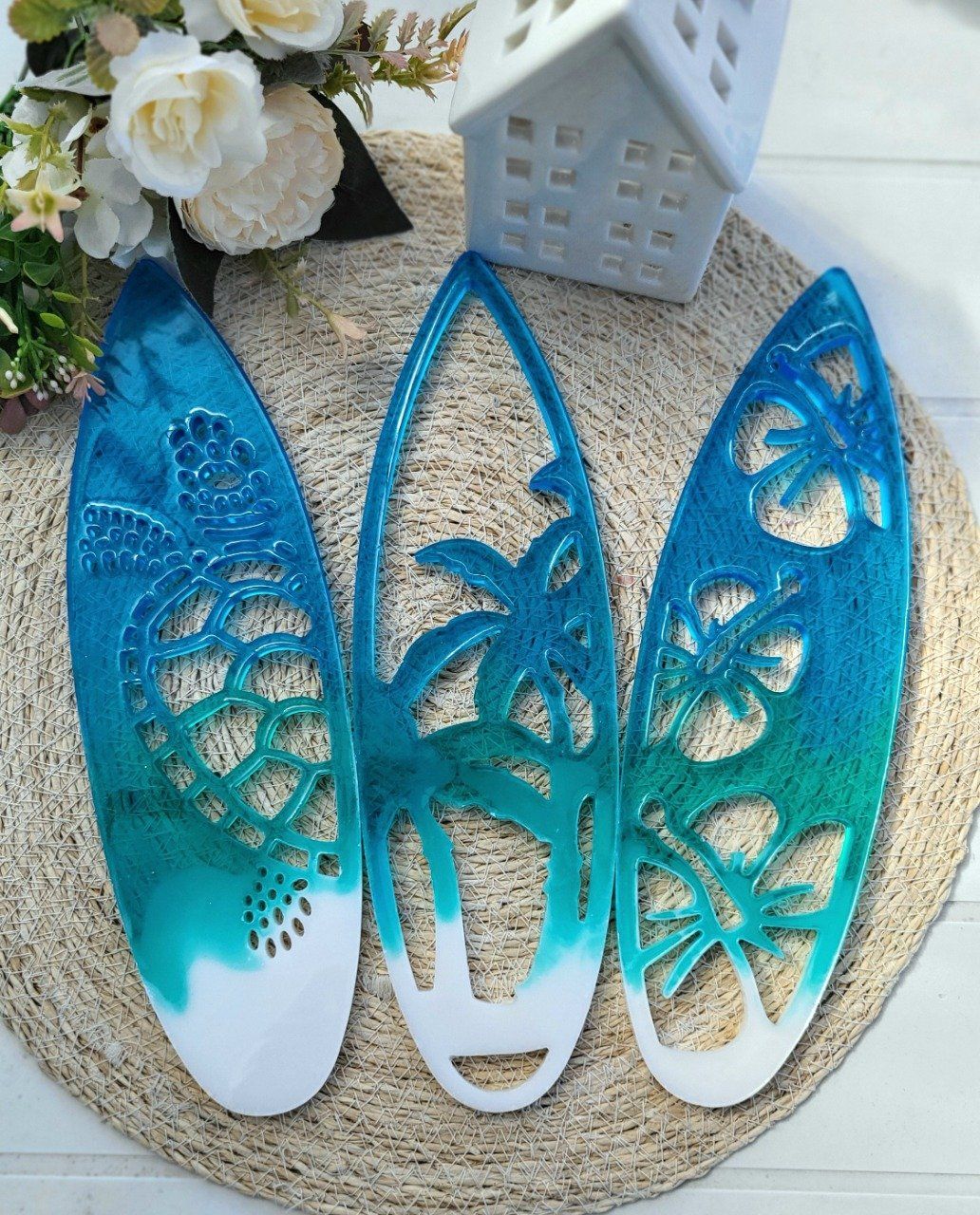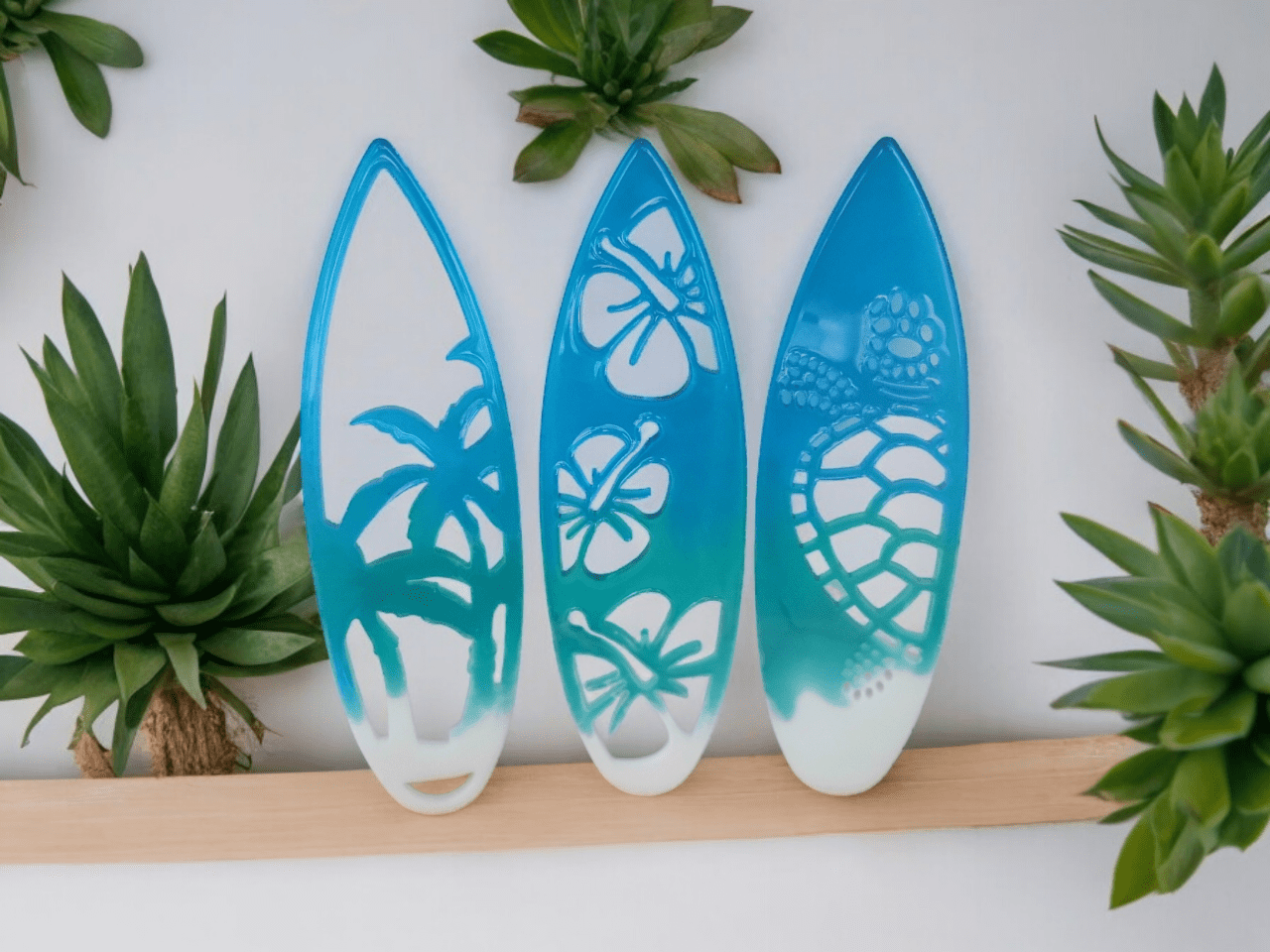Découvrez notre magnifique décoration murale en forme de planche de surf, réalisée avec passion par Virginie Creations Resine.