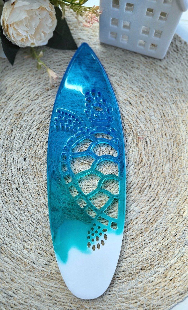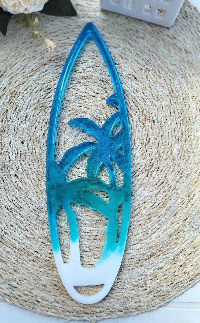 Cette pièce unique allie l'art du resin art à un design inspiré de l'univers de la plage et du surf.