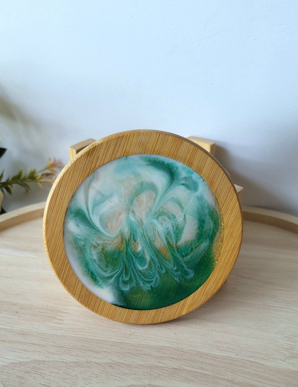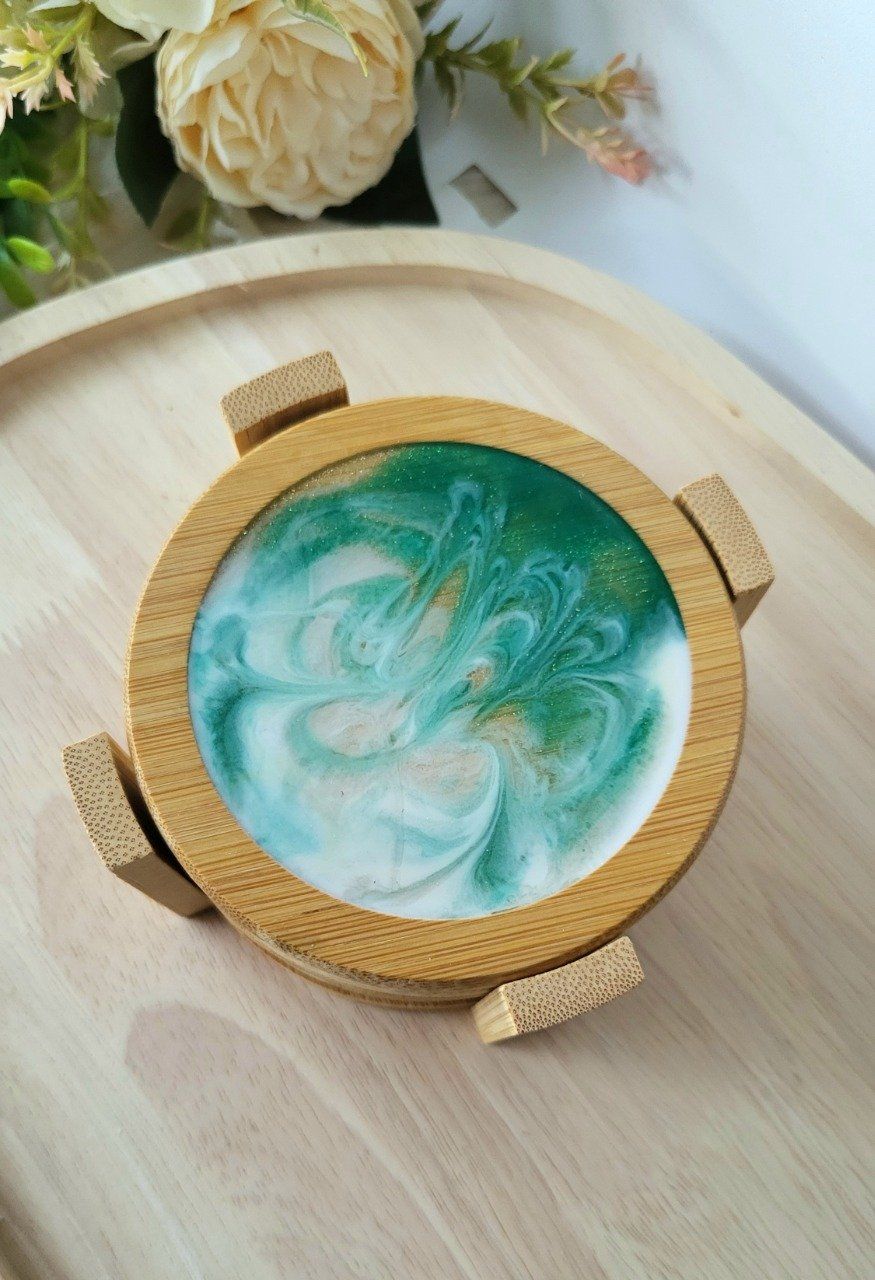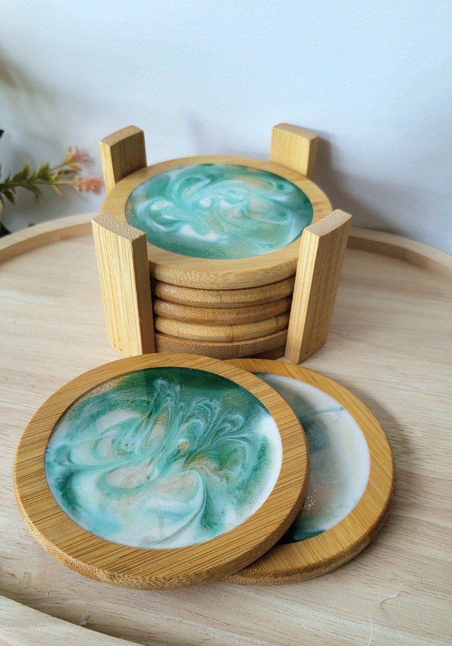 Ajoutez une touche d'élégance naturelle à votre intérieur avec ce magnifique set de 6 dessous de verre faits main, réalisés en résine époxy aux effets marbrés vert d'eau et blanc nacré, et encadrés de bois de bambou. Chaque pièce est unique, avec des tourbillons délicats qui rappellent la mer et la nature, sublimés par une pointe de paillettes discrètes.