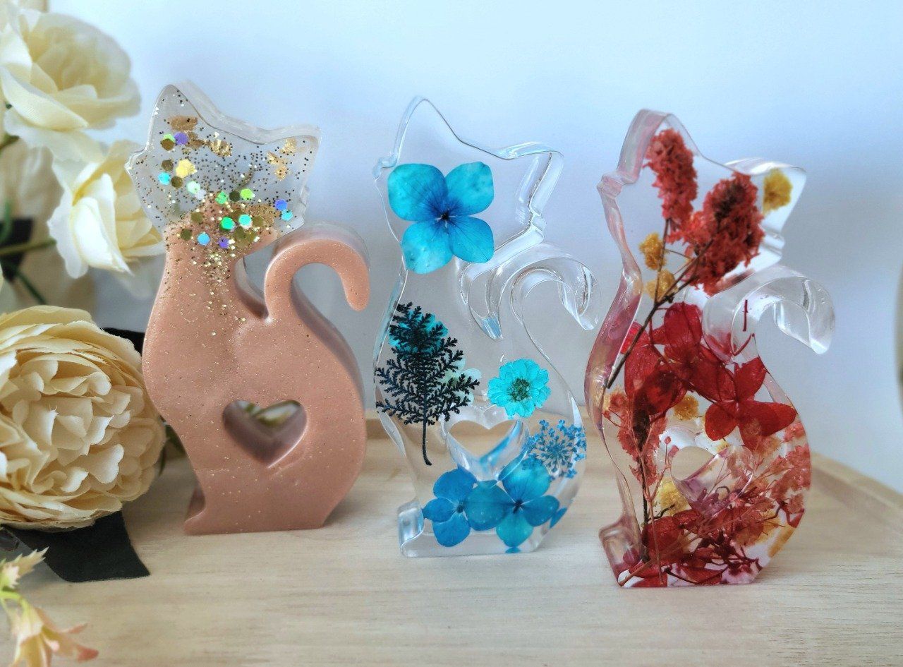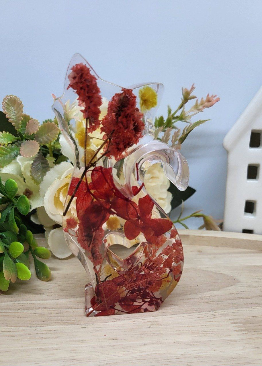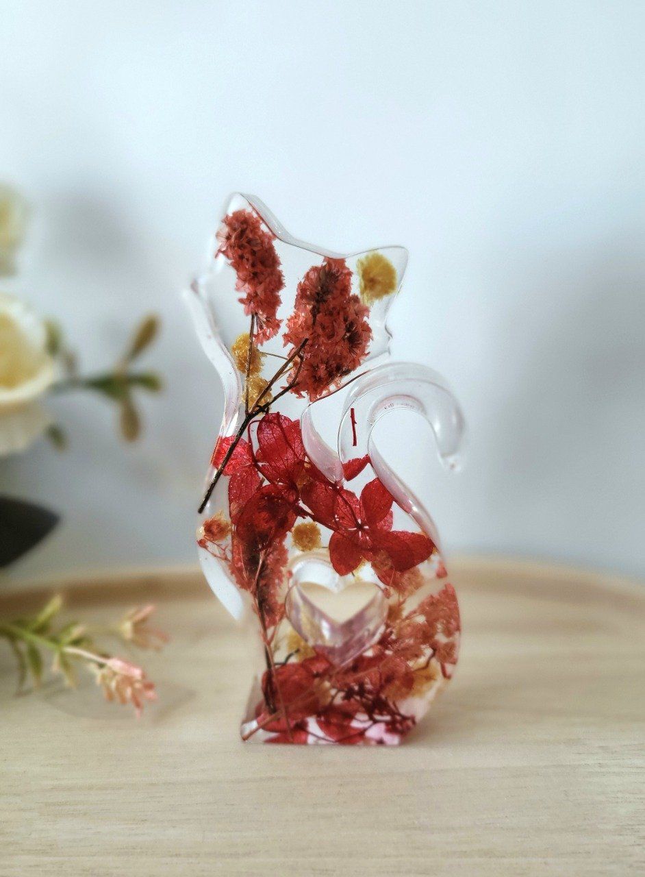 Figurine chat avec coeur au cente avec fleurs sechees ou paillettes holographiques