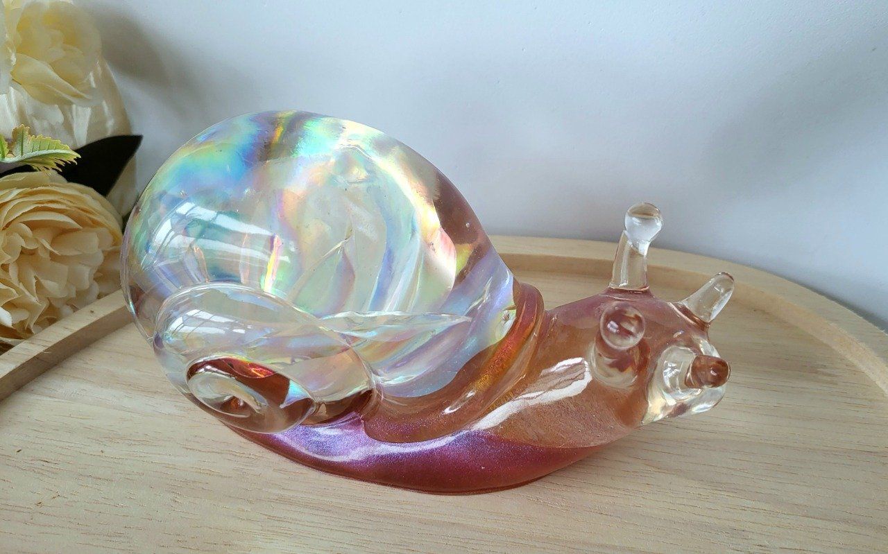 Grand escargot réalisé en résine époxy avec une fleur holographique