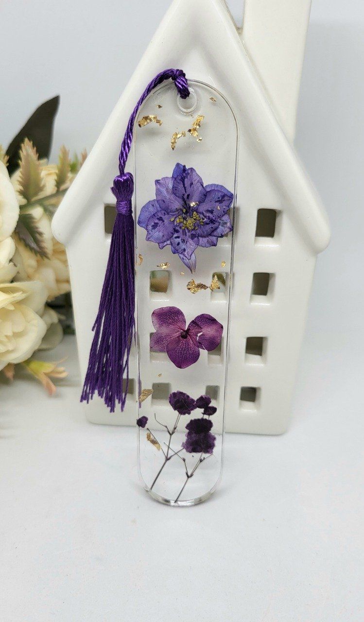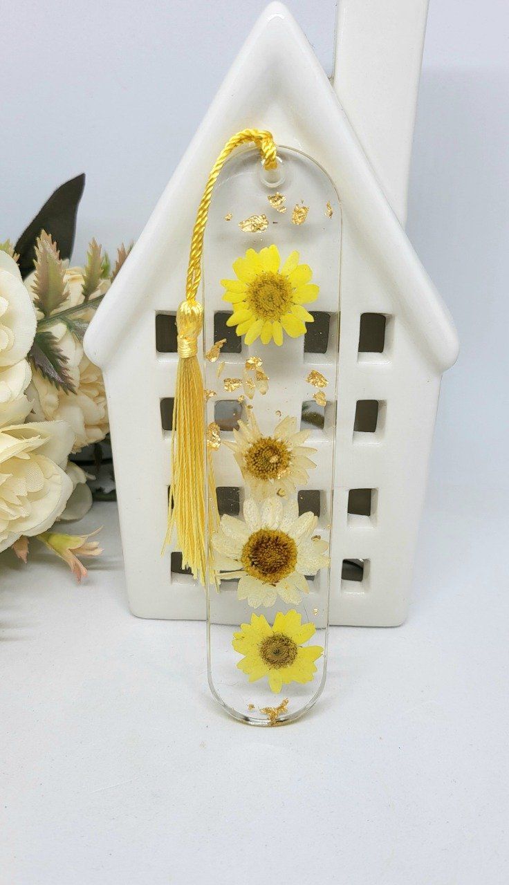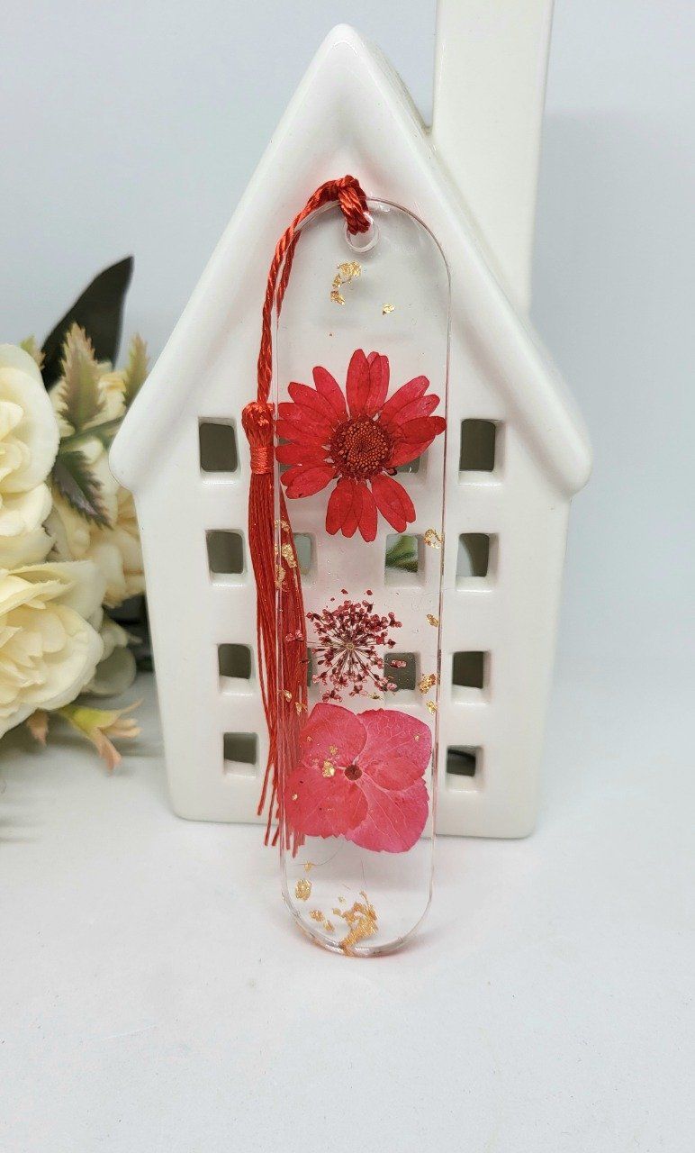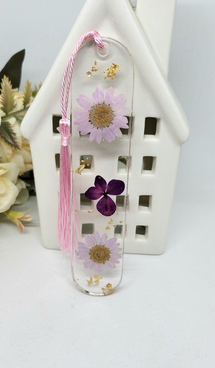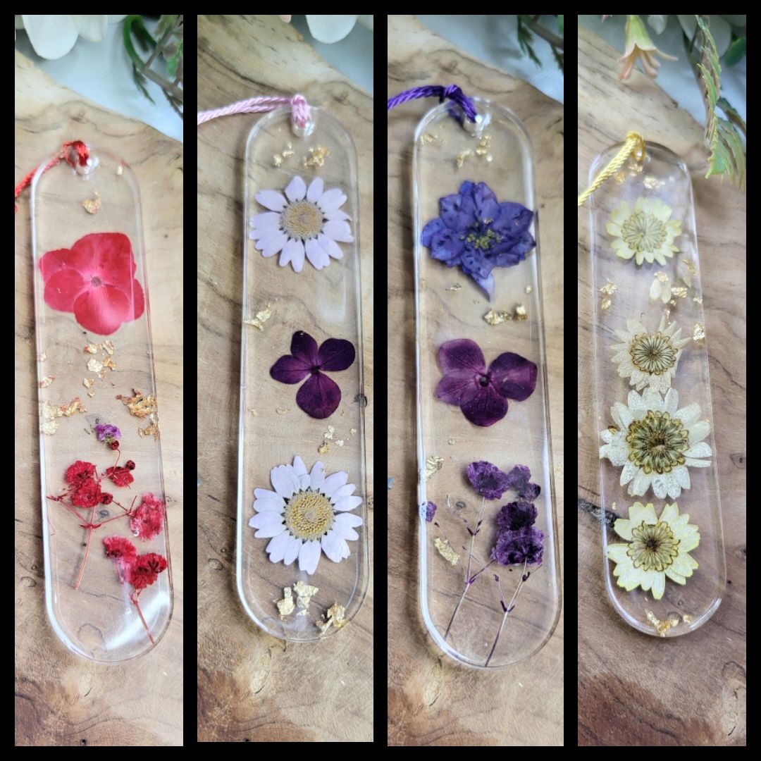 Adorable marques pages tout en transparence avec de véritables fleurs séchées et feuilles d'or.