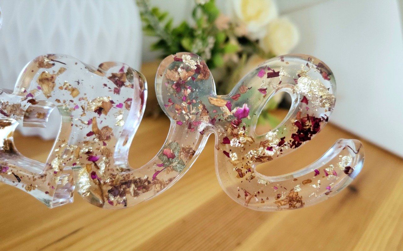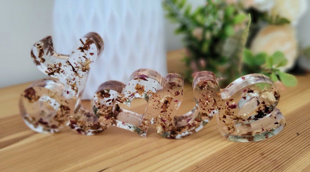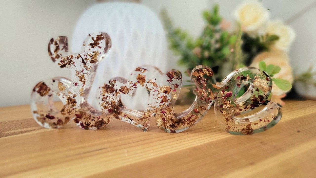 Découvrez notre mot décoratif LOVE tout en transparence avec pétales de roses et feuilles dorées, parfait pour ajouter une touche d'élégance et de modernité à votre intérieur. Fabriqué avec soin par Virginie Creations Resine, ce mot décoratif est idéal pour apporter une note d'amour à votre décoration.